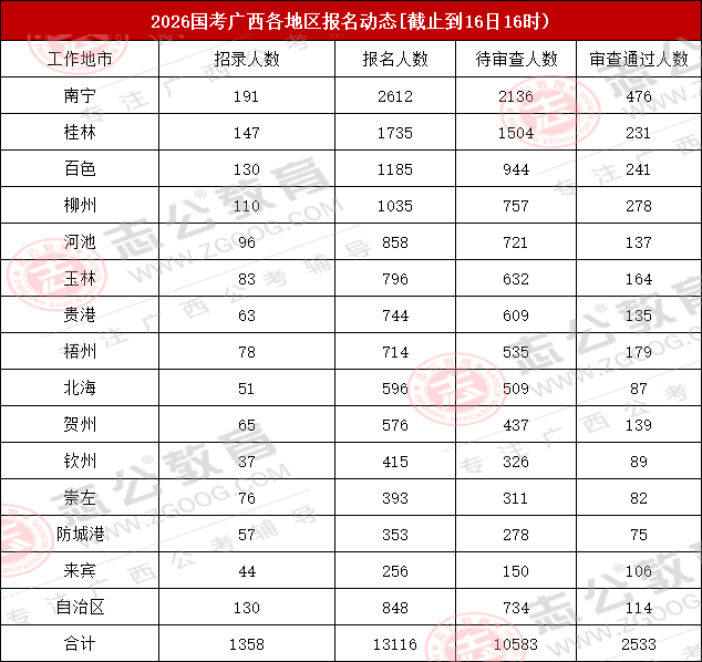 截止到16日16時(shí),2026國考廣西地區(qū)各地市報(bào)名人數(shù)最多的地市為南寧、桂林、百色,其中南寧報(bào)名人數(shù)為2612人,位居第一!整體報(bào)考人數(shù)達(dá)13116人!對(duì)此,小志建議大家,報(bào)考崗位時(shí)需將自身職業(yè)愿景與個(gè)人實(shí)際條件(如專業(yè)、學(xué)歷、基層經(jīng)驗(yàn)等)緊密結(jié)合,理性分析崗位競爭情況,最終做出最適合自己的選擇。