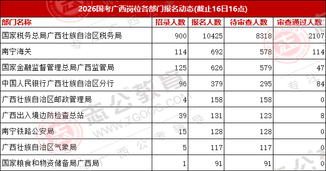 國考報(bào)名第二天,不少同學(xué)還處在觀望狀態(tài)。目前報(bào)名人數(shù)前三的部門依次為:國家稅務(wù)總局廣西壯族自治區(qū)稅務(wù)局,報(bào)名人數(shù)10425人;南寧海關(guān),報(bào)名人數(shù)692人;國家金融管理總局廣西監(jiān)管局,報(bào)名人數(shù)626人;這三個(gè)部門的報(bào)考總?cè)藬?shù)達(dá)11743人,報(bào)考熱度高度集中。