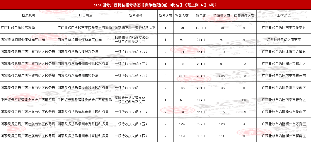 我們接著來看廣西地區(qū)國考報(bào)名競爭最激烈的前十職位匯總情況。當(dāng)前,國家稅務(wù)總局廣西壯族自治區(qū)稅務(wù)局-國家稅務(wù)總局桂林市臨桂區(qū)稅務(wù)局的【一級(jí)行政執(zhí)法員(三)】 職位,以220人的報(bào)名數(shù)成為目前前十職位中最熱門的選擇。