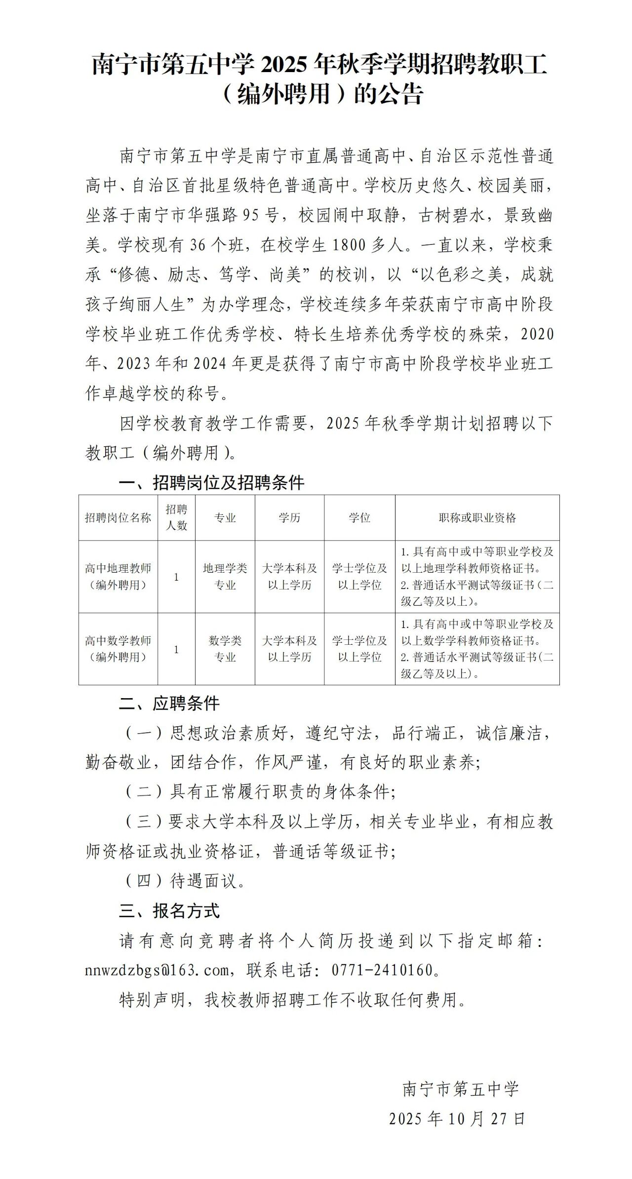 2025年南寧市第五中學(xué)秋季學(xué)期招聘教職工(編外聘用)的公告