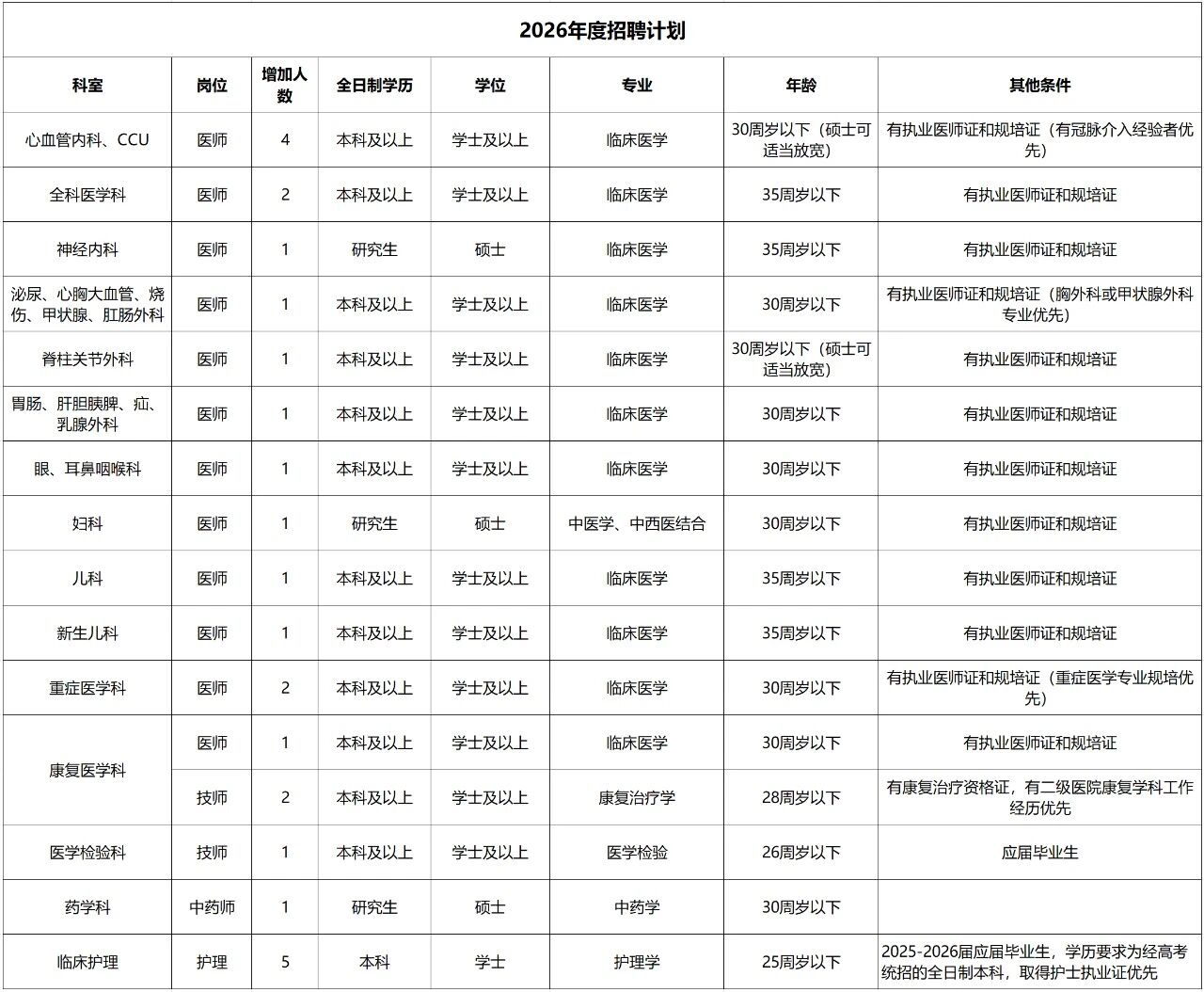 (二)醫院招聘的所有崗位均要求畢業(yè)時(shí)須同時(shí)取得應聘崗位所需的學(xué)歷、學(xué)位證,緊缺崗位可放寬學(xué)位條件。同時(shí)須取得住院醫師規范化培訓合格證書(shū)、醫師資格證書(shū)、醫師執業(yè)證書(shū)。
